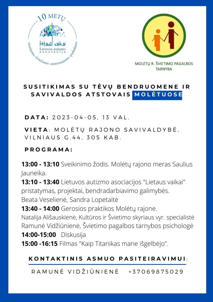Maloniai kviečiame dalyvauti Pasaulinės autizmo supratimo dienos proga organizuojamame susitikime-popietėje, skirtoje tėvams/globėjams, auginantiems autizmo spektro sutrikimų turinčius vaikus. Susitikimas vyks 2023 m. balandžio 5 d. nuo 13 val. Molėtų r. savivaldybės 305 kab. (III aukštas).