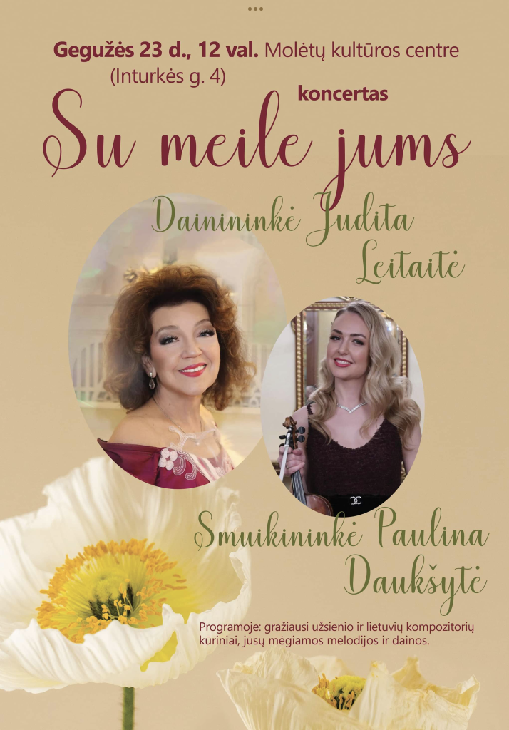 Molėtų TAU studentus maloniai kviečiame į iškilmingą Molėtų trečiojo amžiaus universiteto 2021-2023 mokslo metų uždarymą, kuris vyks gegužės 23 d. 12 val. Molėtų kultūros centro salėje. Apžvelgsime Molėtų TAU veiklas, paminėsime aktyviausius studentus, pasiklausysime koncerto, kuriame gražiausius užsienio ir lietuvių kompozitorių kūrinius atliks dainininkė Judita Leitaitė ir smuikininkė Paulina Daukšytė.