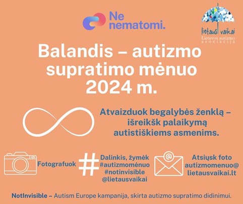 fotografuokite, pieškite, atvaizduokite. Begalybės ženklo nuotraukas kelkite į savo socialinius tinklus, žymėkite @lietausvaikai #autizmomėnuo, #lietausvaikai #notinvisible #AutismDay2024